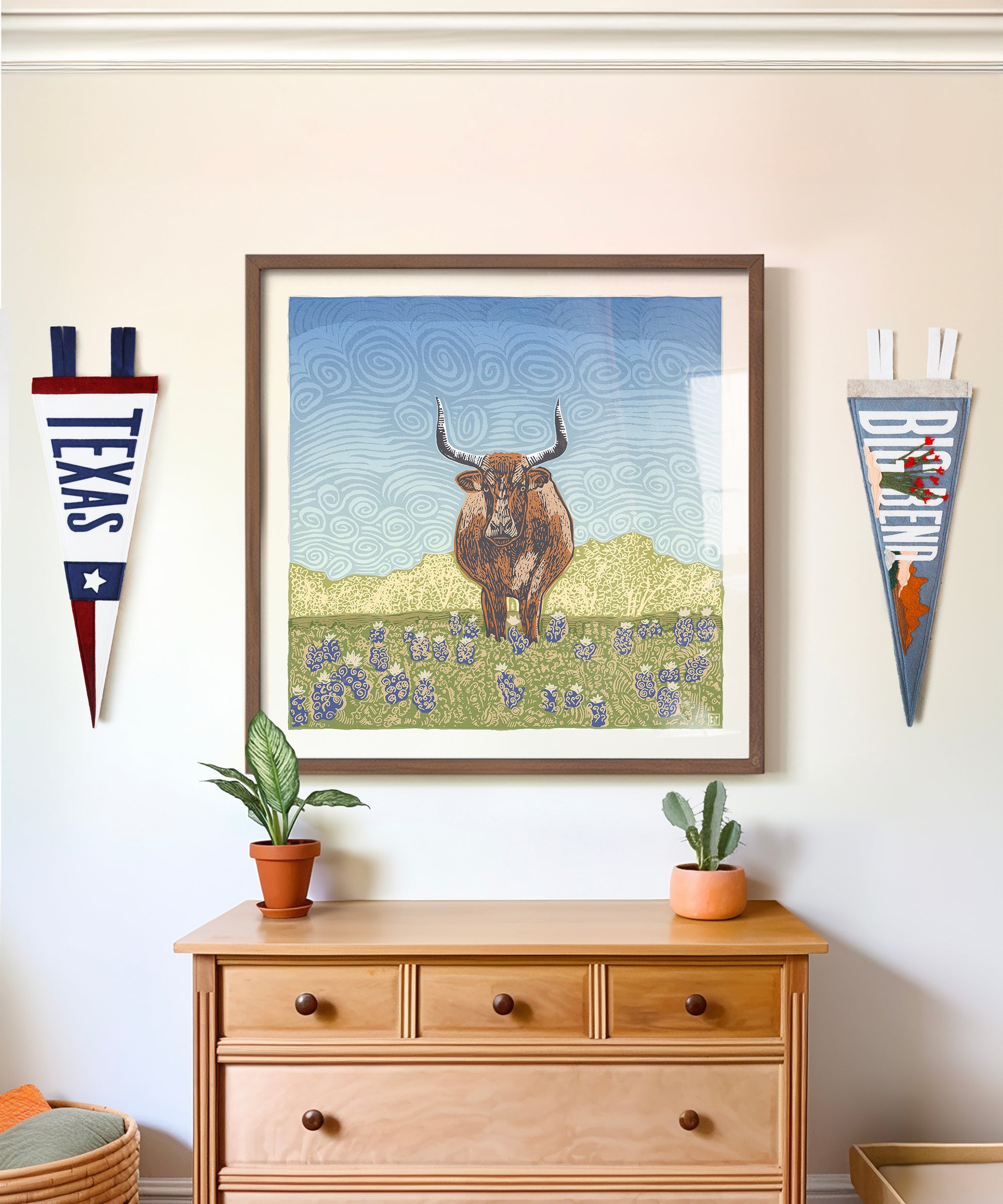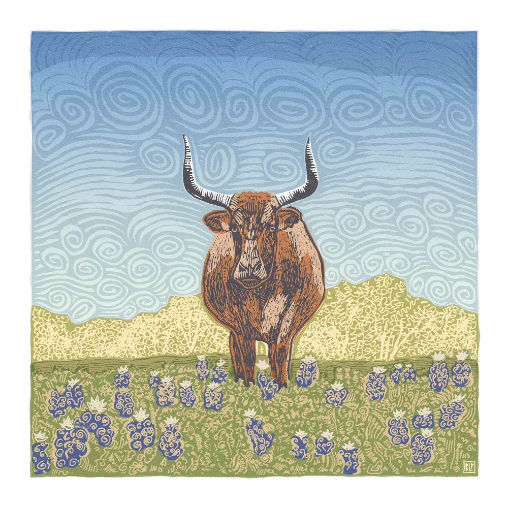 This whimsical western piece, entitled "Blue Bonnet Bull," features two Texas icons - the longhorn and blue bonnet. Done in Peterson's classic woodcut style, this piece brings an imaginative new take to a western landscape, with swirling clouds and spiral fields.