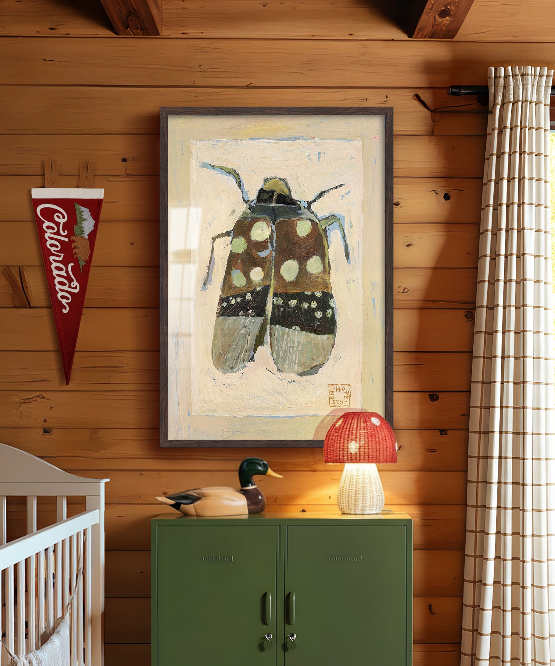 Meet your new bug bestie! Curious Critter by Hope Olson brings woodland charm to life through a lovely palette of oil paints in that signature folk-art style she’s known for. Perfect for a cabin-inspired nursery or nature-loving little one, this beautiful bug adds a touch of sophistication and curiosity to any wall. Pair it with Olson’s Beetle On Blue for a dynamic duo of forest friends.