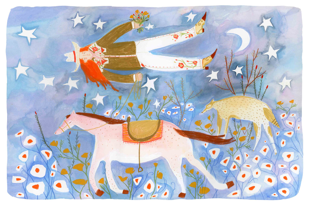 "Dream Journey" is the fitting title of this beautiful western print by Melissa Lakey. Featuring a dreaming cowgirl floating above her horse, this piece makes a marvelous match with its companion piece "Who's Dreaming Who?". With its charming aesthetic and serene hues, this print will bring a soothing presence into any little one's room.