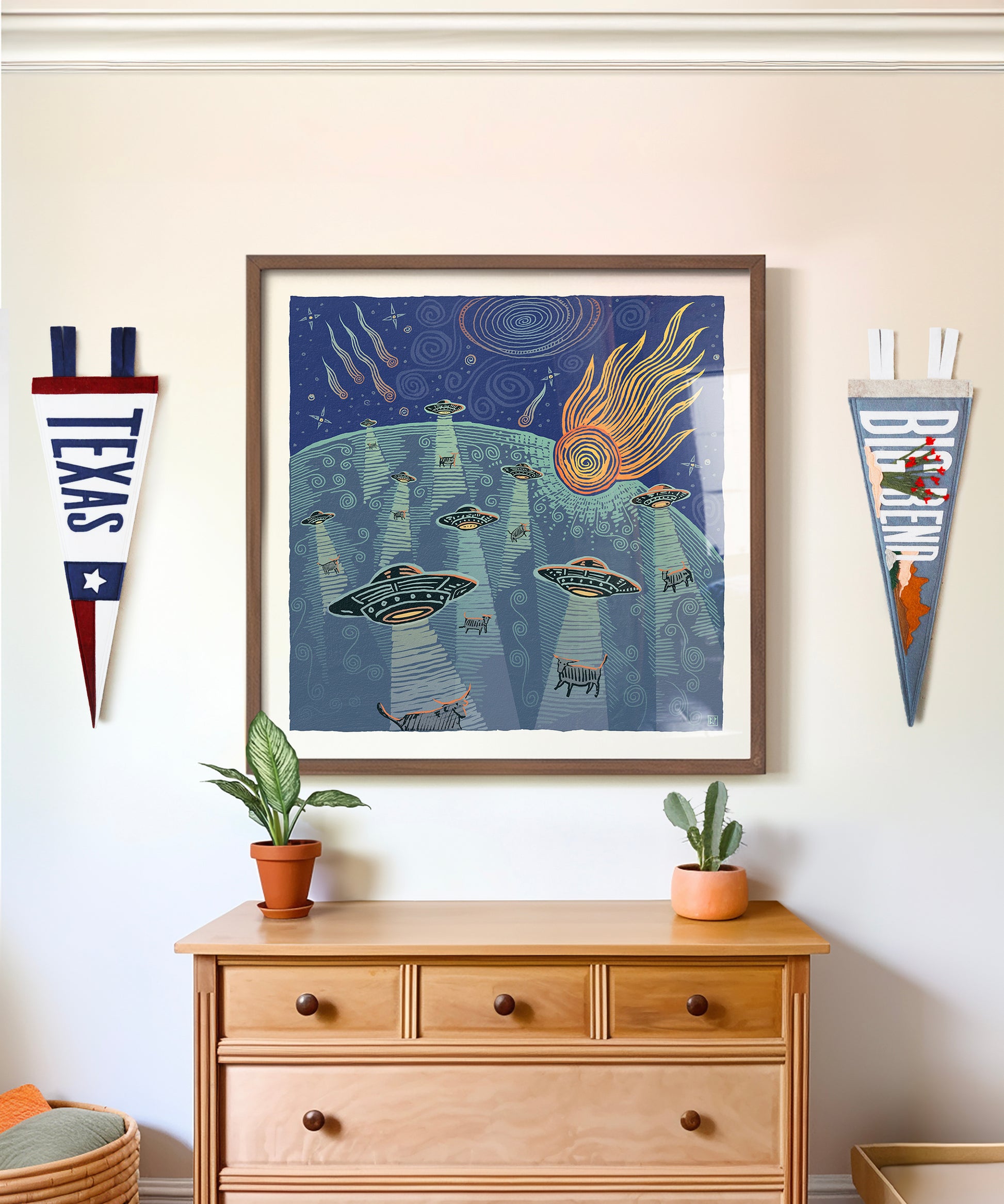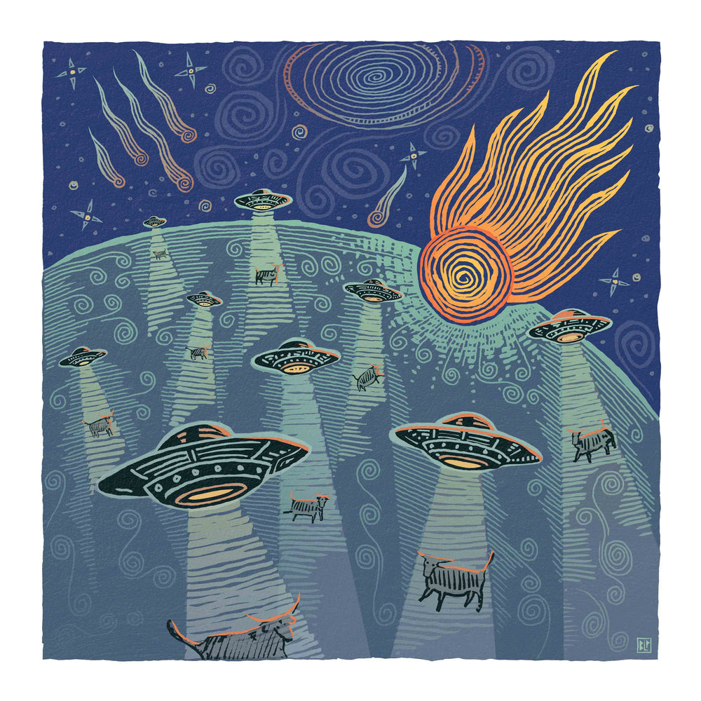 Earth is under attack in this imaginative print from the cosmic mind of Bryan Peterson! Aliens abduct cattle while fireballs blaze across the night sky, creating a scene brimming with both fun and chaos. Created in Peterson's distinctive woodcut style, this piece captures the essence of the cosmic West, adding a touch of interstellar charm to your space.