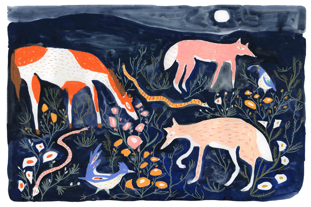 This magical piece, featuring desert animals gathering below a full moon, is a part of Melissa Lakey's colorful western collection. With a couple coyotes, some snakes, a horse and a roadrunner, this piece shows that we can all get along! This nighttime piece will bring the calm and serenity, and pairs perfectly with Melissa's daytime desert animal piece, "When All the Animals Get Together."