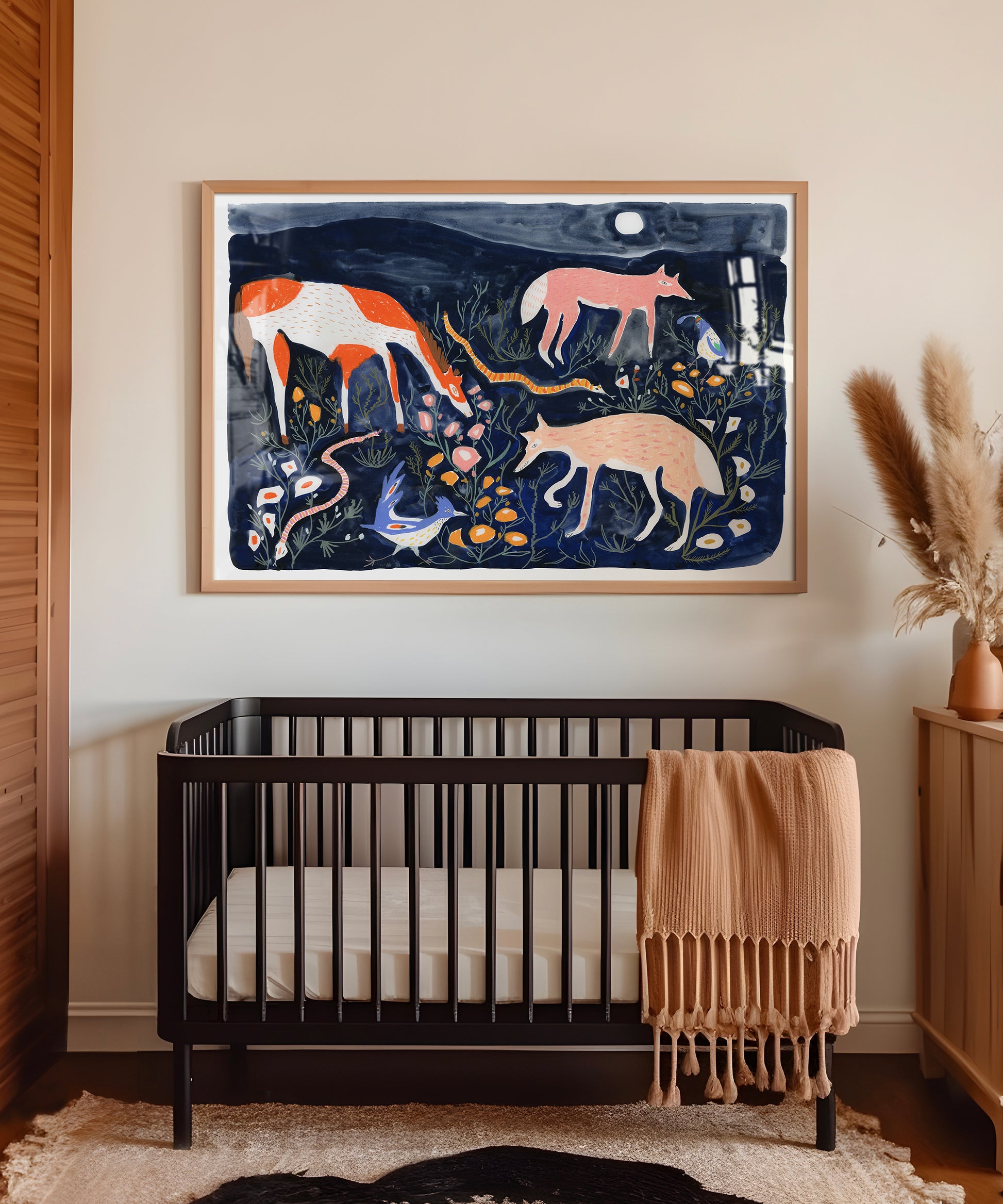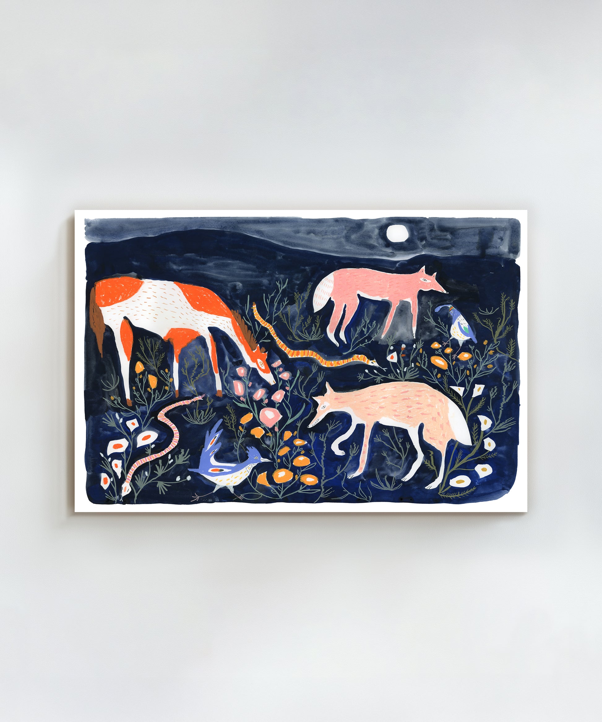 This magical piece, featuring desert animals gathering below a full moon, is a part of Melissa Lakey's colorful western collection. With a couple coyotes, some snakes, a horse and a roadrunner, this piece shows that we can all get along! This nighttime piece will bring the calm and serenity, and pairs perfectly with Melissa's daytime desert animal piece, "When All the Animals Get Together."