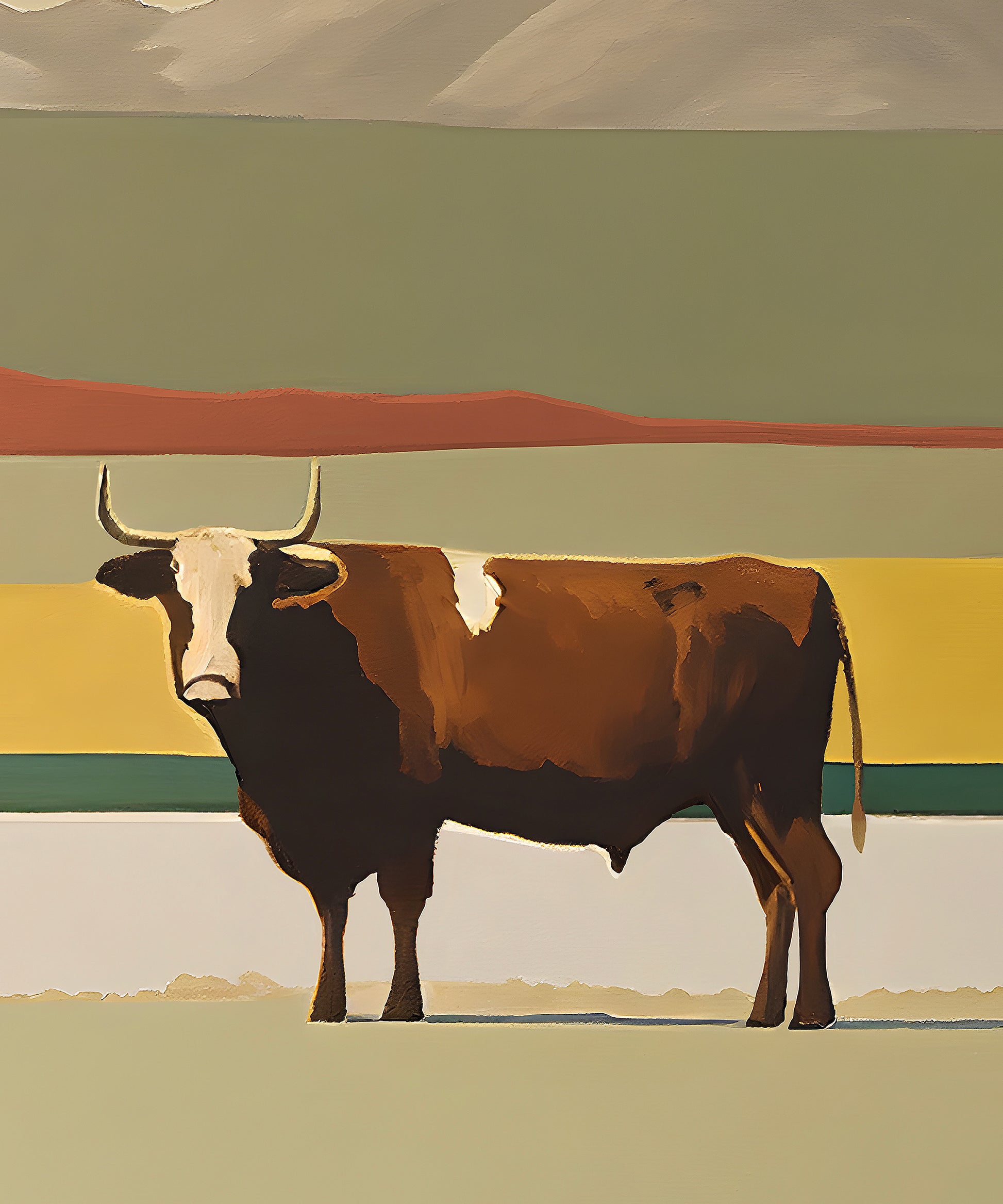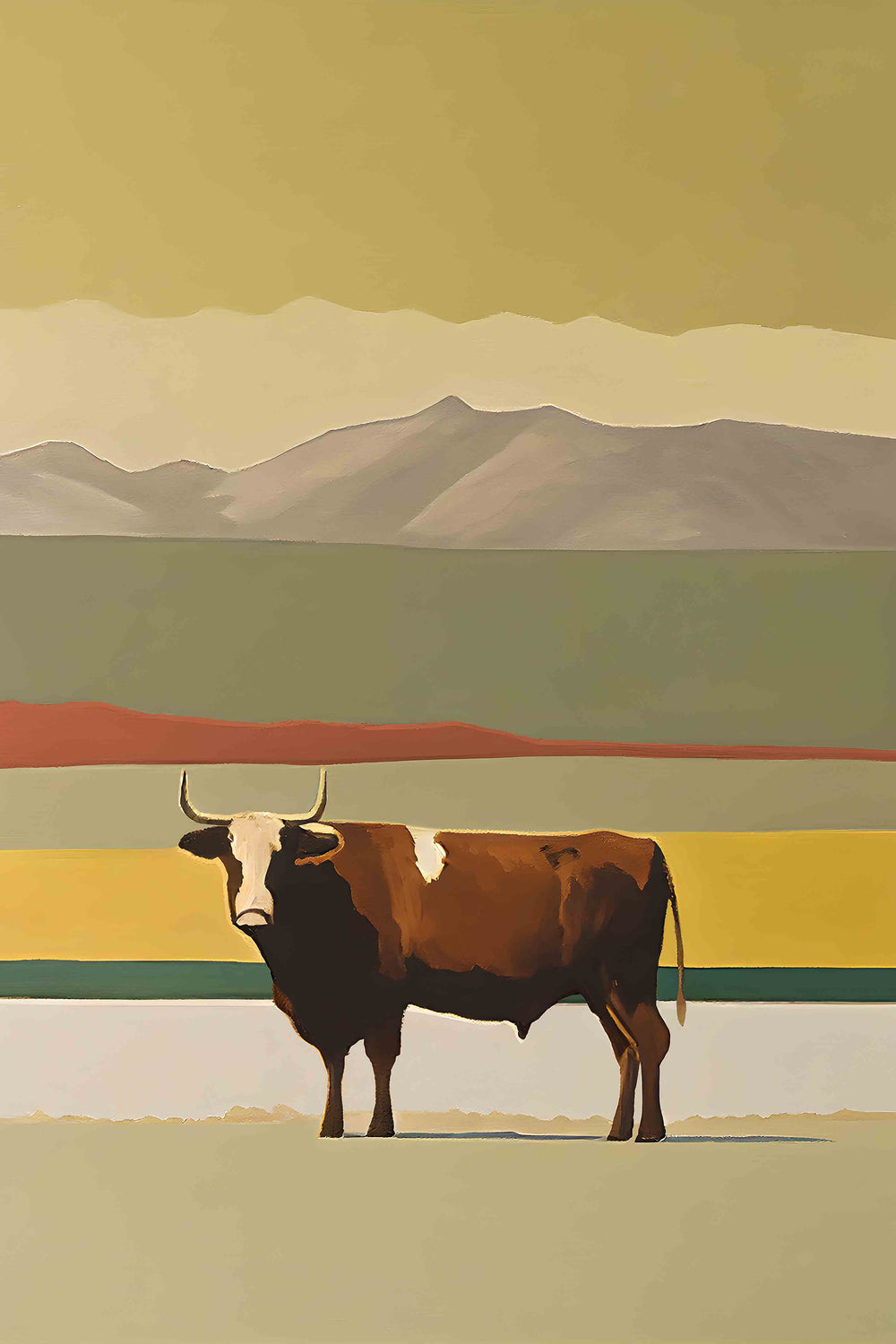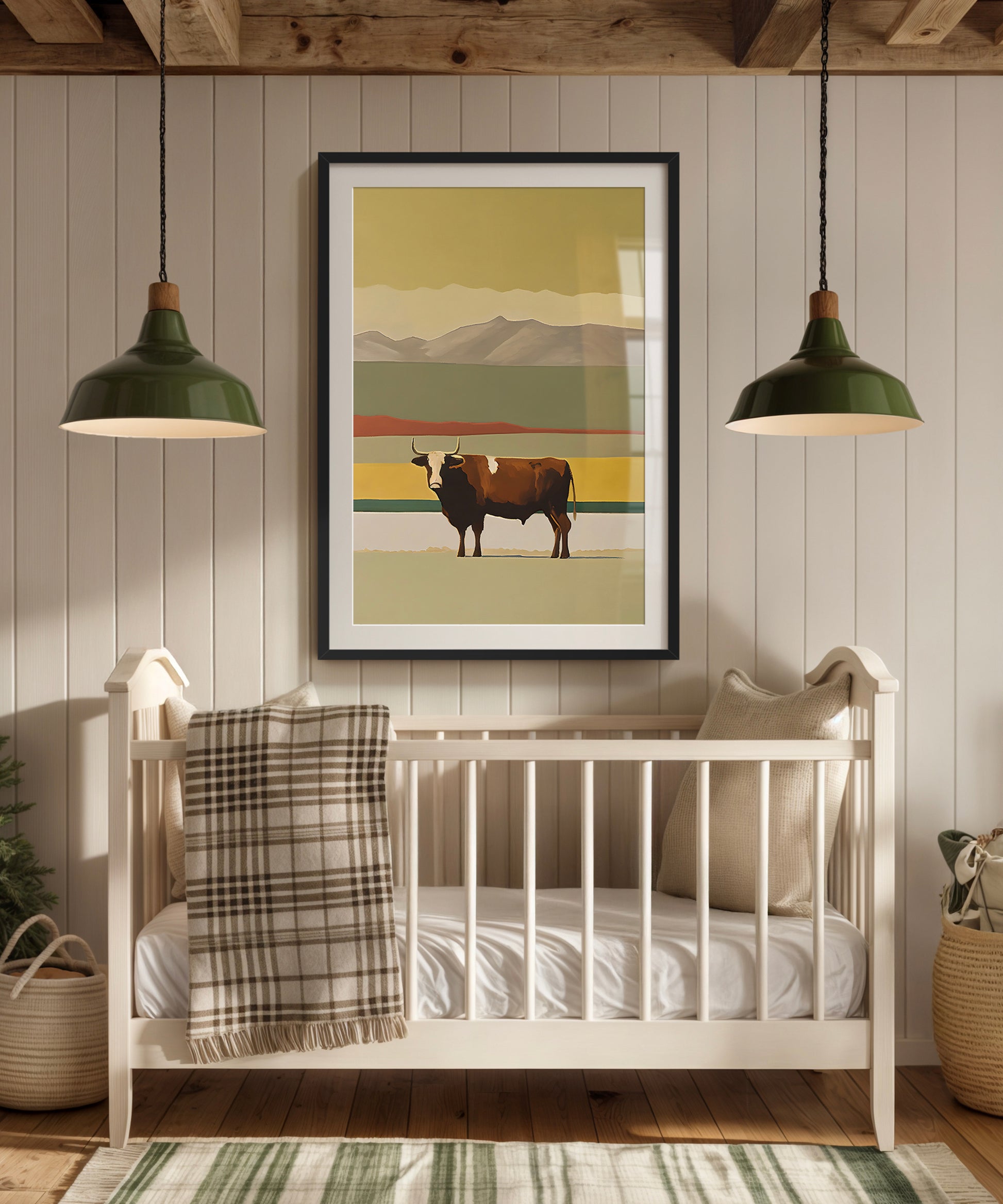 You won't want to steer clear of this beautiful print! Created in a sophisticated yet simple oil painting style, this piece captures a majestic steer standing tall against soft, sun-faded layers of prairie and peaks. With clean lines and earthy hues, it brings just the right mix of rustic charm and modern style to your little cowpoke’s crib-side view.