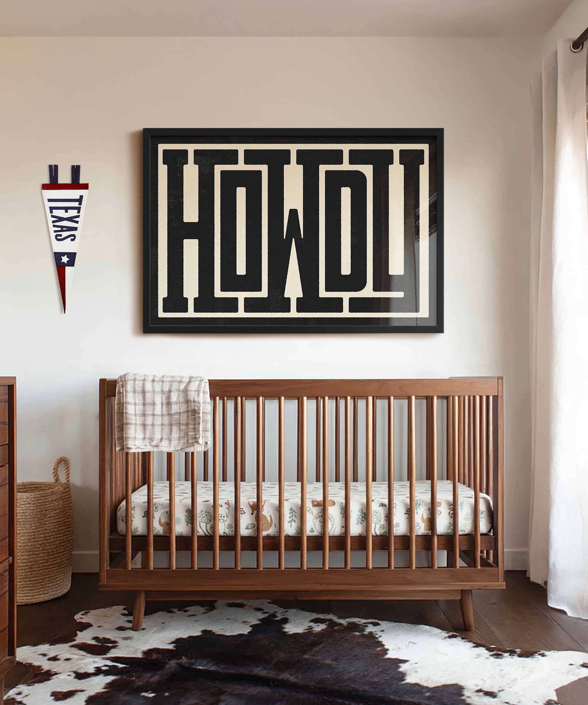 The perfect welcome to the world for your little cowpoke, our Howdy typography print makes a bold and playful statement in any western nursery. Featuring custom-designed block type, it’s western with a modern twist. Made to grow with your kiddo, it’s cute enough for the nursery and cool enough to stay up long after the diapers are gone.