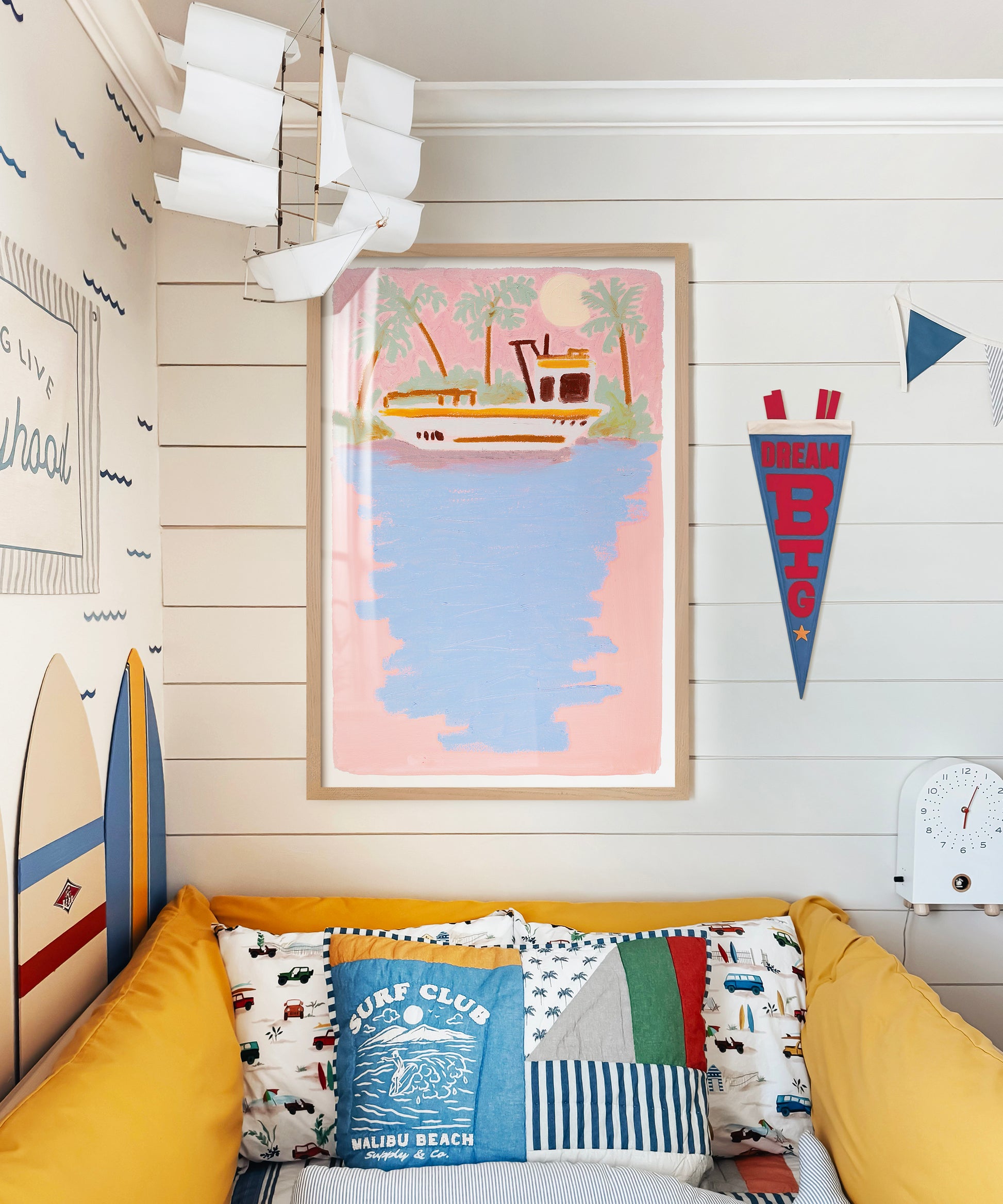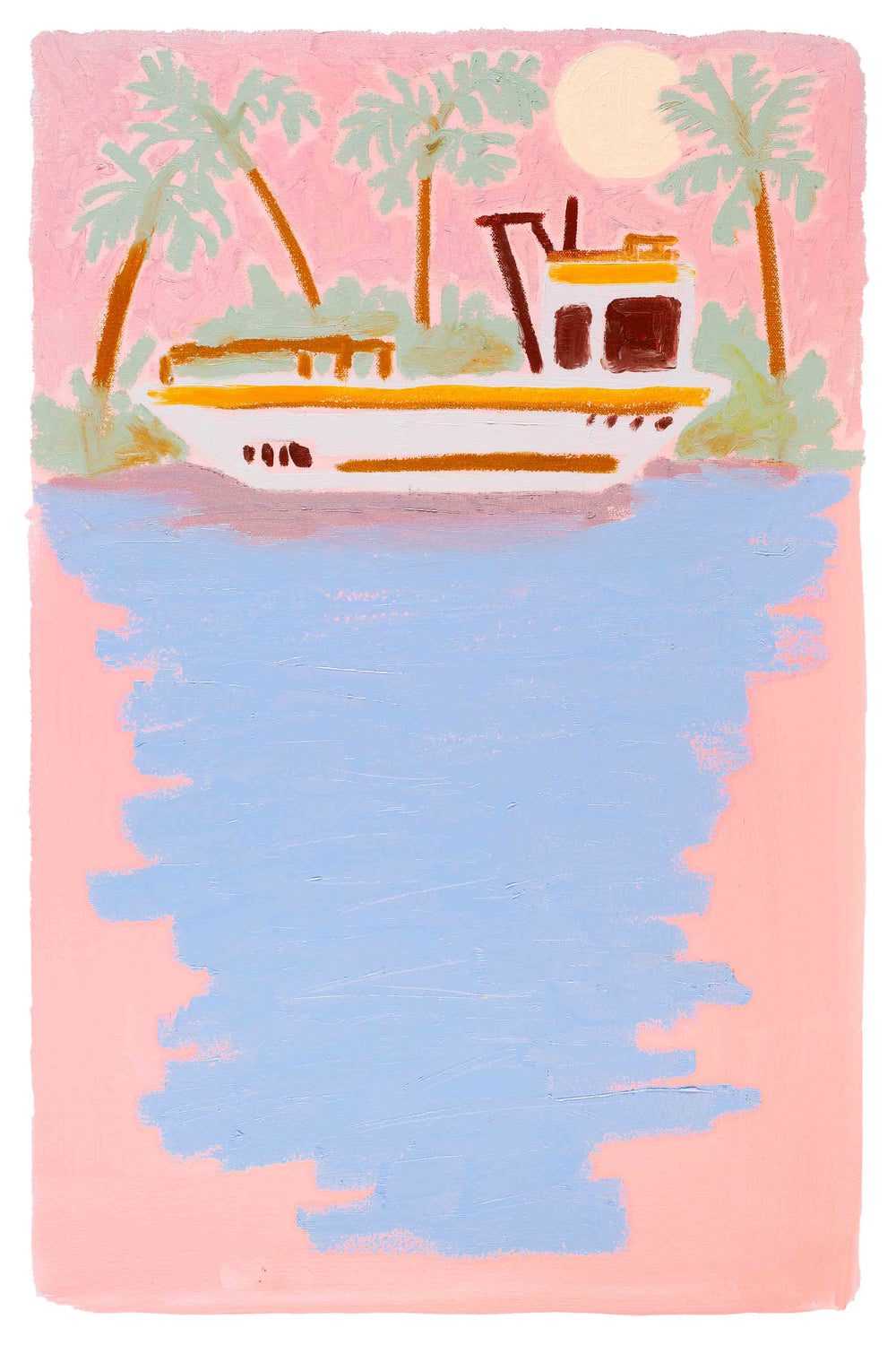 The moon rises over the bay in this beautiful piece by Melissa Lakey. With soft pink and blue hues, it captures the serene atmosphere of a peaceful night on the water. Hang it solo for a subtle touch of color, or for the perfect pastel pairing, display it alongside one of Melissa's three other boat-themed pieces.