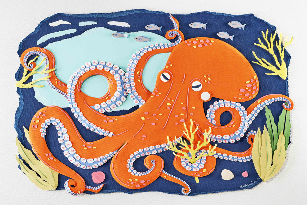 This intricate octopus, designed by paper artist Andrea Cira, will be a beloved addition to your child's coastal-themed room. With an original created from meticulously cut and layered paper, this print boasts a distinctive 3D appearance. The octopus' twisting tentacles are adorned with intricate details, providing a sense of depth that makes this sea creature pop right out of the print!