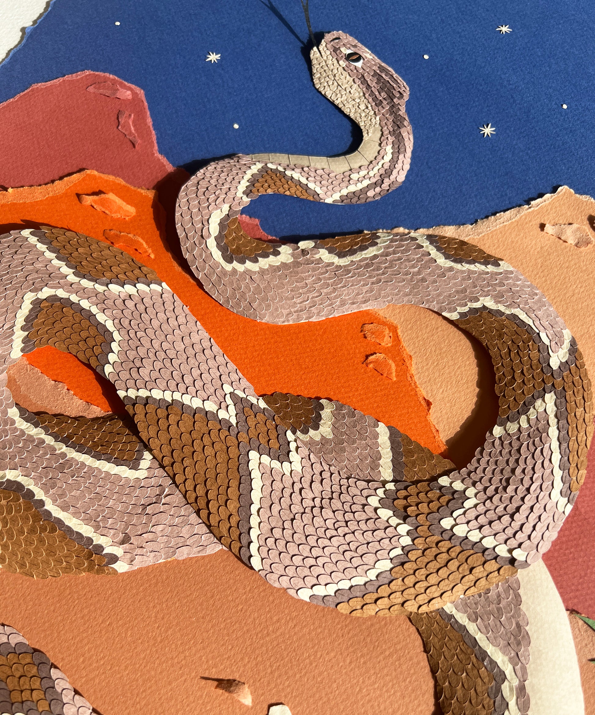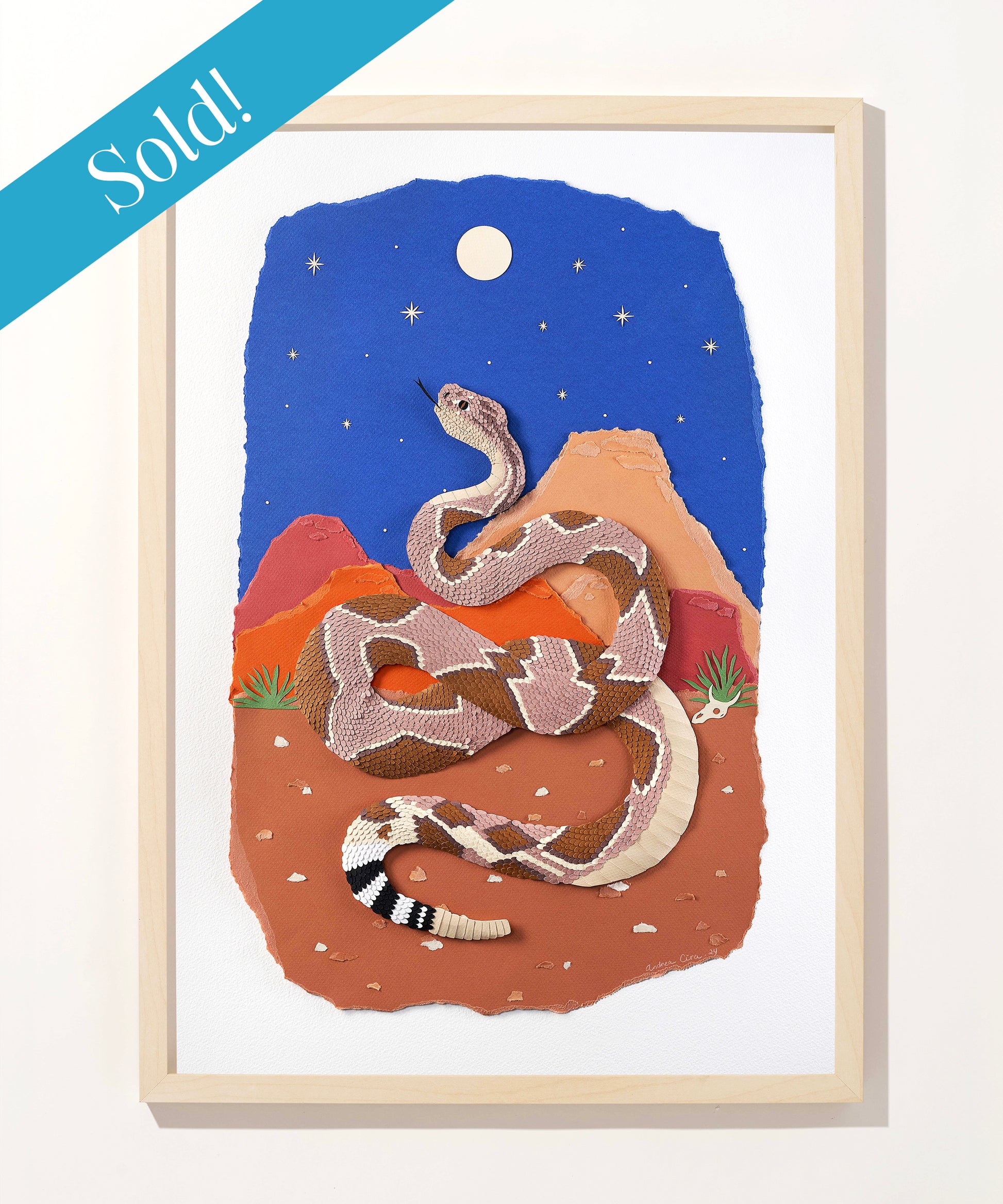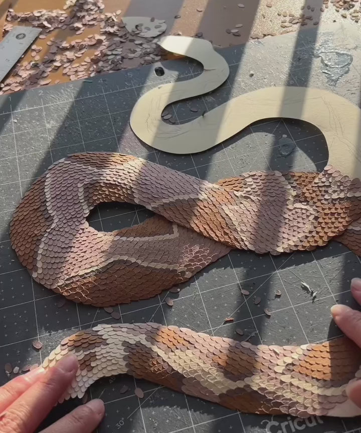 This is your chance to own an amazing original piece by Andrea Cira! This beautiful rattlesnake was crafted from thousands of pieces of paper, with each scale meticulously placed by hand. The result is a brilliant 3D paper artwork filled with depth and color.