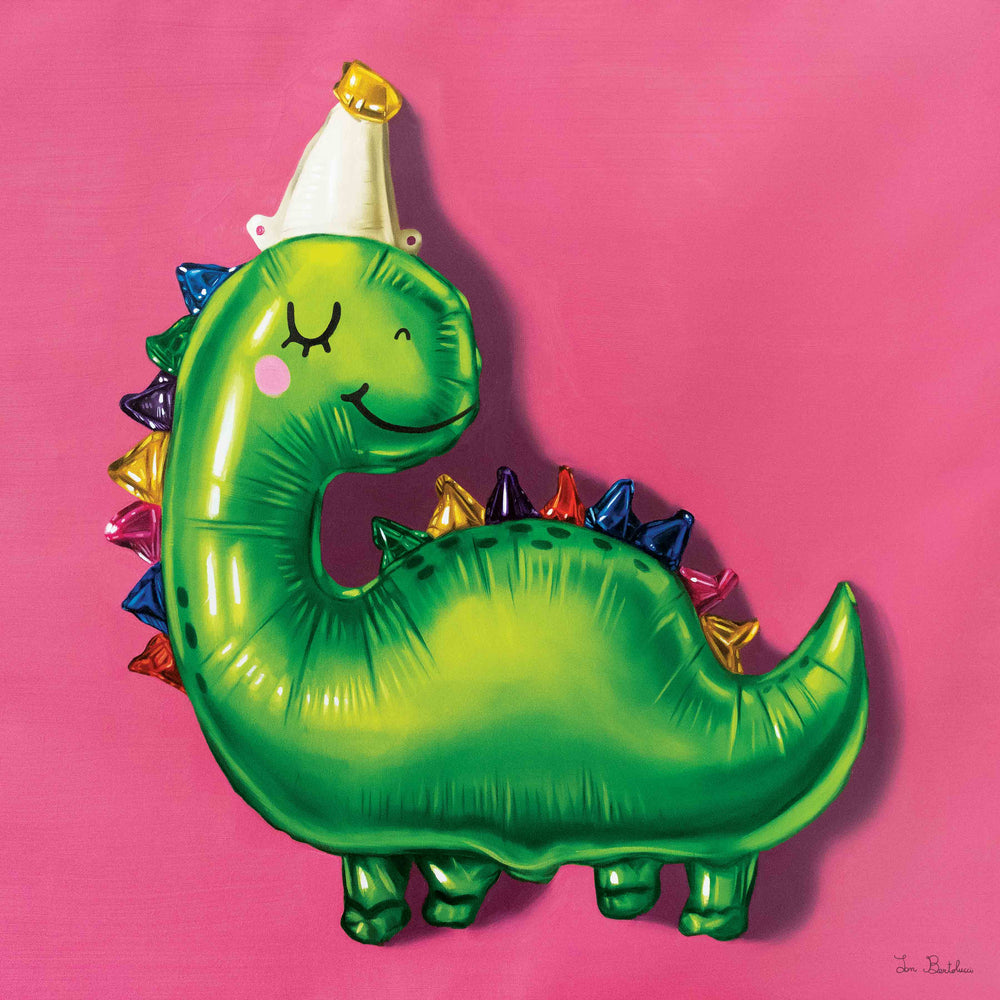 Introducing "Party Dino" by the amazingly talented Ian Bertolucci. With its festive colors and vibrant background, this dino is clearly the life of the party! Done in Bertolucci's signature mylar-balloon style, you'll have trouble telling the artwork apart from real party balloons—but the one big difference: this one won’t deflate!