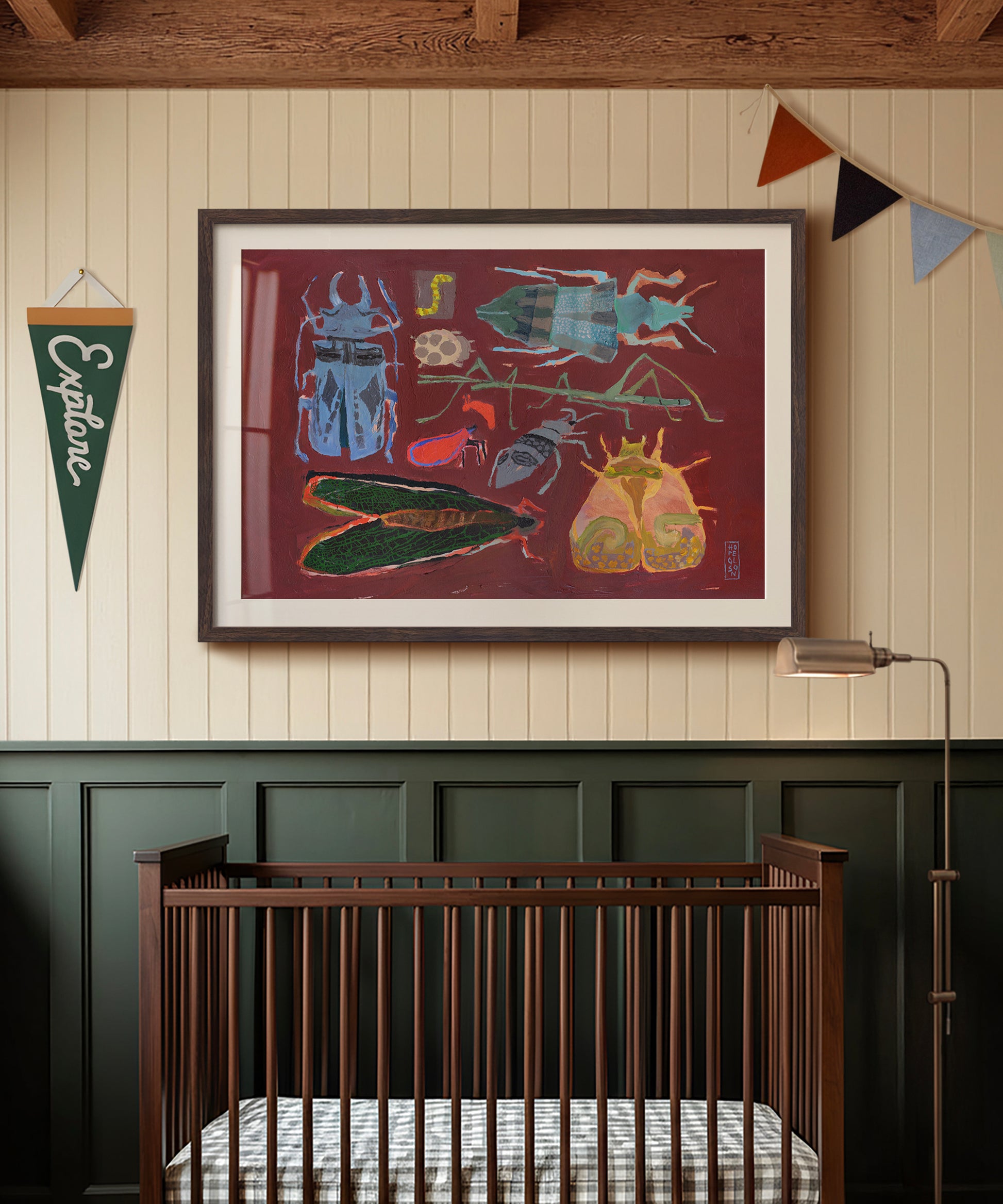 A collection of curious critters, "Plaid Jacket" by Hope Olson is the perfect print for your bug-obsessed little boy. Crafted in Olson's whimsical folk-art style, this piece features an array of fascinating bugs like the playful stick bug. The perfect print to make the centerpiece in your woods or cabin-themed nursery, "Plaid Jacket" makes bugs something you’ll actually want in your house!
