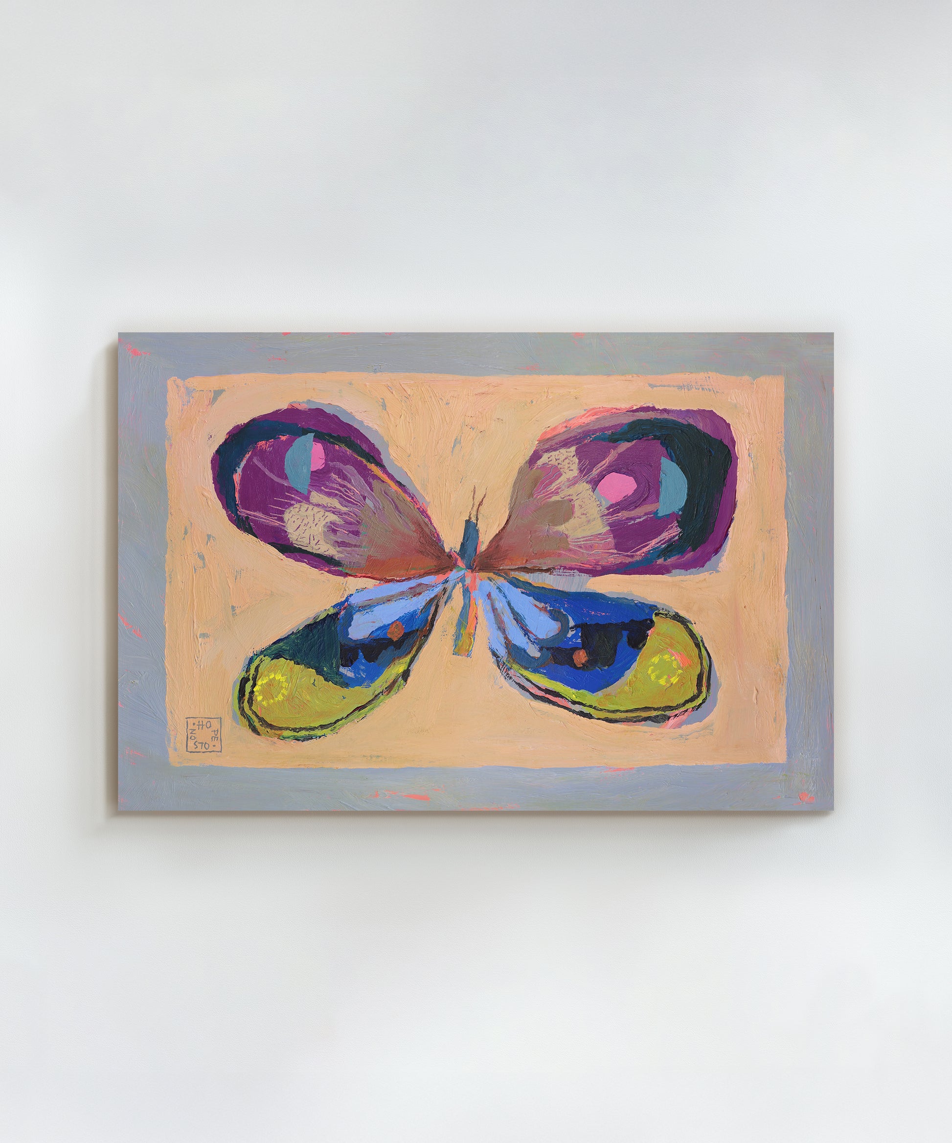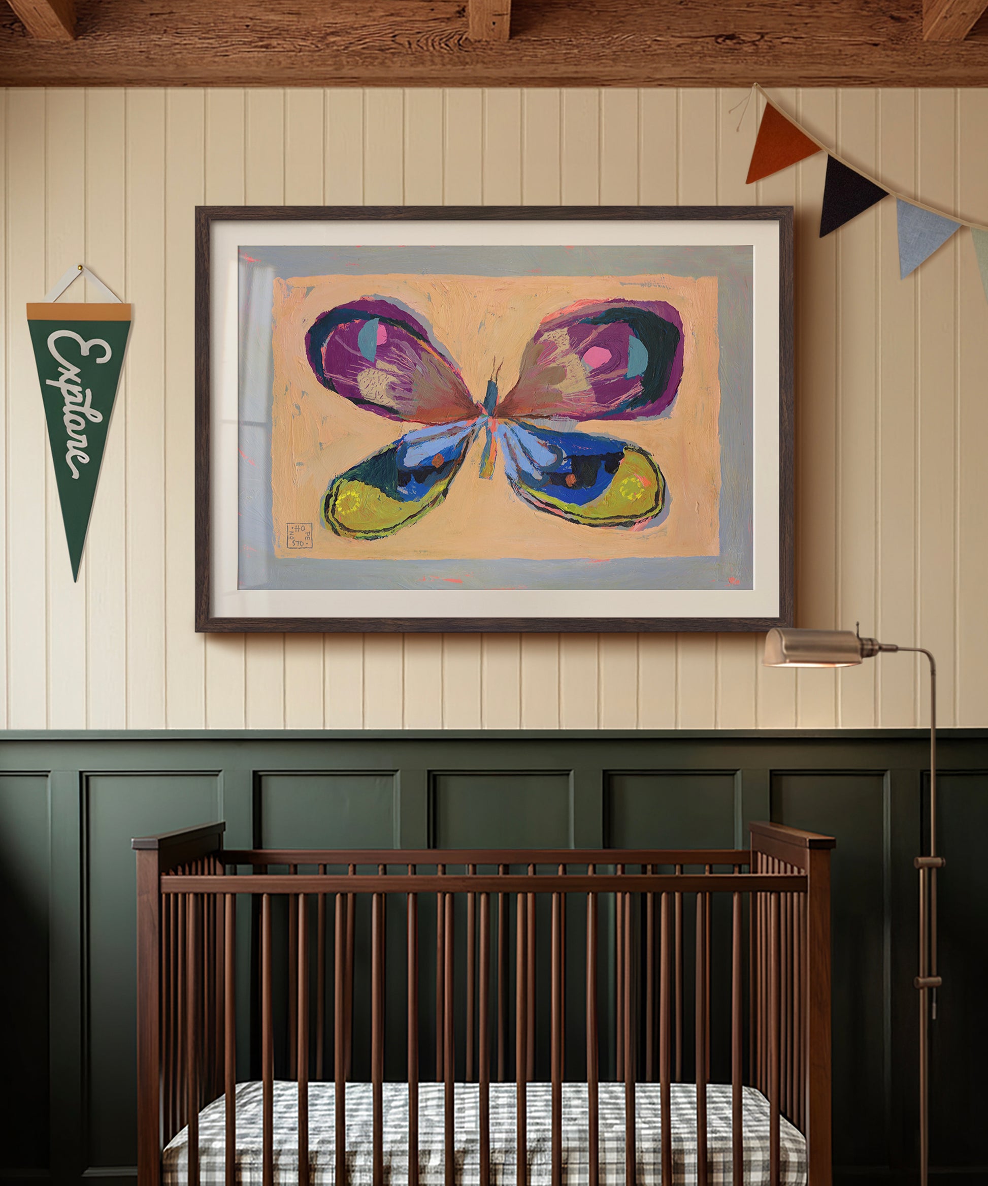 Big, bold, and beautiful, this butterfly is ready to steal the spotlight on your walls! Originally crafted in jewel-toned oil paints by Hope Olson, the vibrant brushstrokes and layered hues make this piece both colorful and cozy at the same time. Featuring vivid blues, rich pinks, and a soft purple border, this stunning butterfly will bring a touch of wonder and warmth to your little one's space.