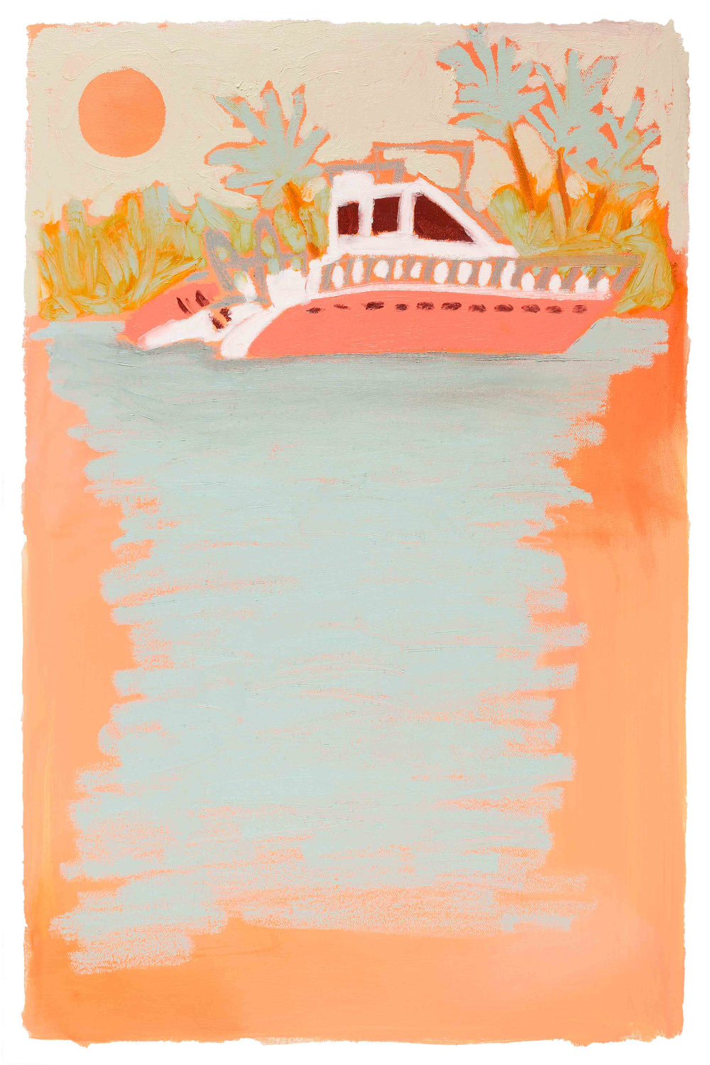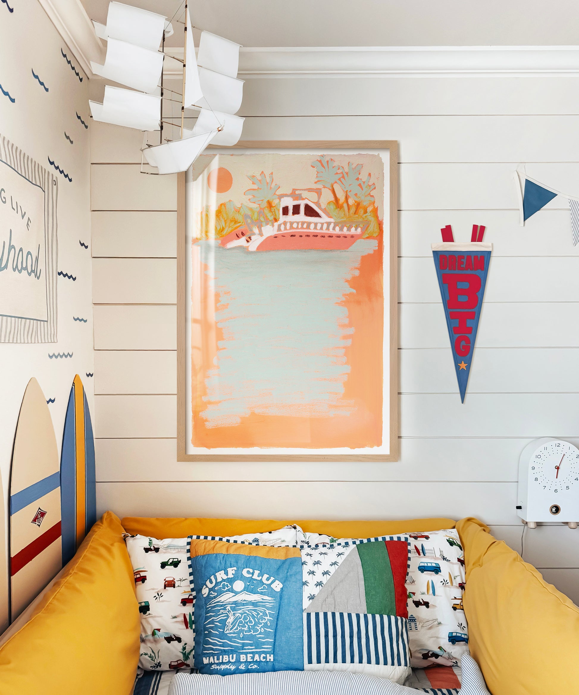 Melissa Lakey uses charming pastels to capture the warm orange hues of a sunset in her piece, "Sunset Cruise." Originally created with oil sticks on canvas, this artwork features rich textures and character throughout. Pair it with one of her three other boat-themed pieces for the perfect pop of color in your little one's coastal inspired space.