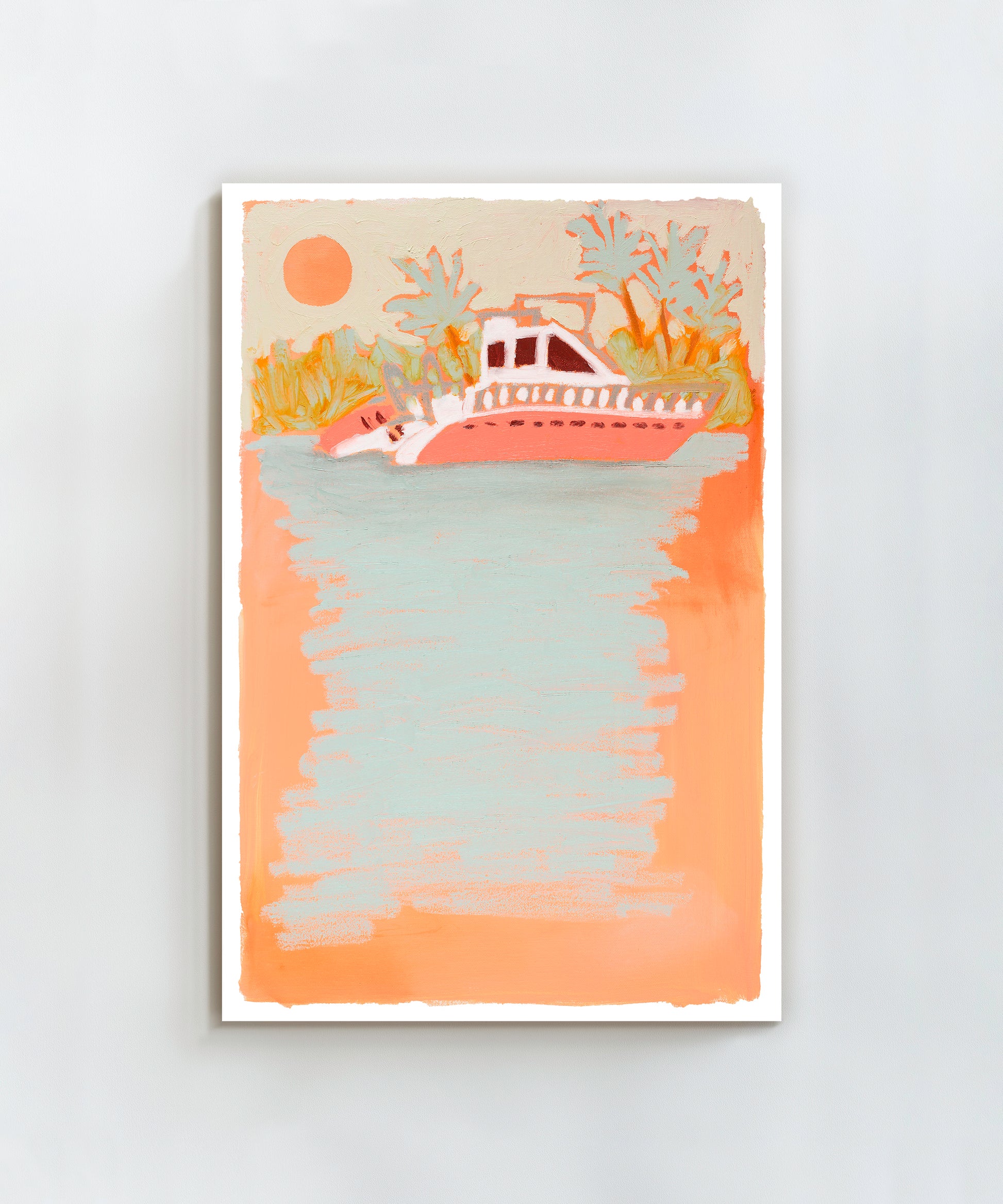 Melissa Lakey uses charming pastels to capture the warm orange hues of a sunset in her piece, "Sunset Cruise." Originally created with oil sticks on canvas, this artwork features rich textures and character throughout. Pair it with one of her three other boat-themed pieces for the perfect pop of color in your little one's coastal inspired space.