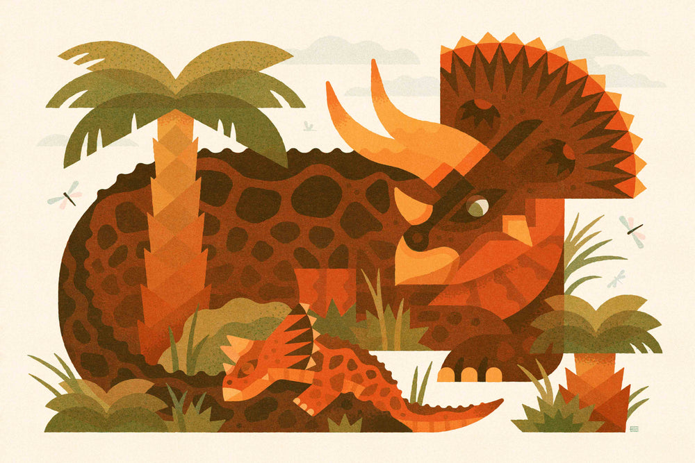 In this cute and cuddly piece, a tuckered-out Triceratops catches up on some much needed R&R. Known for its iconic frill and three-horn combo, the Triceratops was one of the gentle giants of the past. But don’t let their reputation fool you, mess with this dino mama, and she won't hesitate to give you the horns!