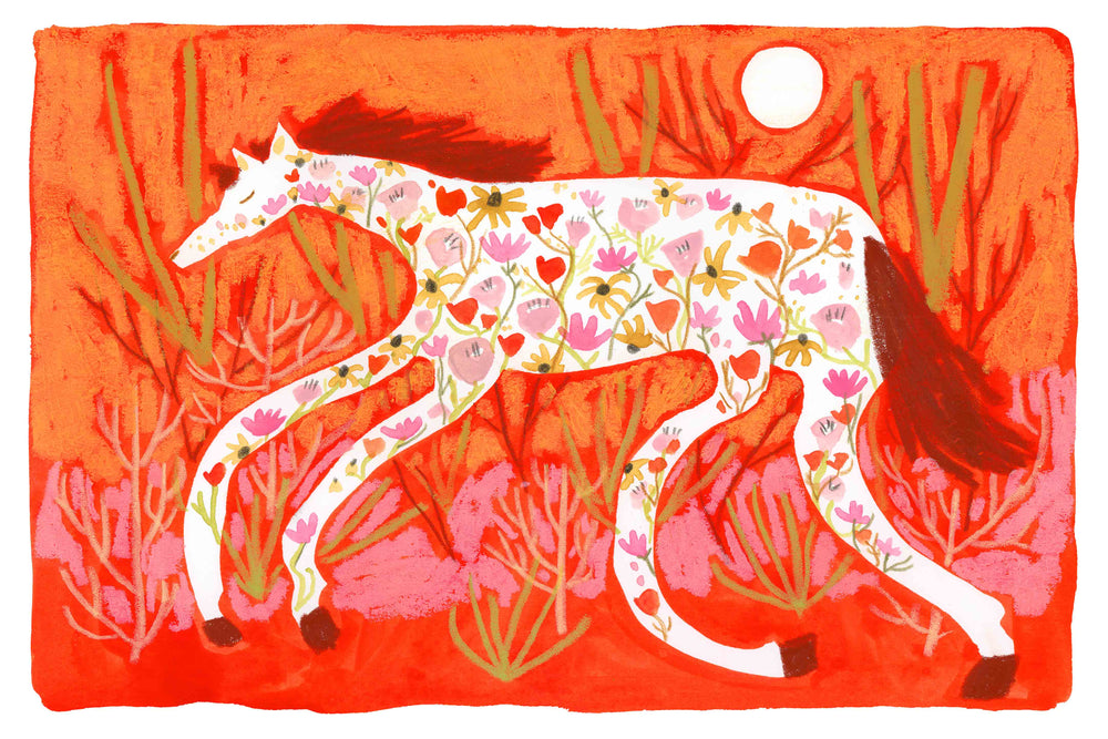 Add a splash of color to your walls with "Wildflower Horse," a whimsical piece showcasing a stunning horse adorned in desert blooms. Ideal for any animal enthusiast or aspiring cowboy or cowgirl, this print perfectly balances vibrant hues with a tranquil vibe. Hang it solo, or mix and match with Melissa Lakey's "Flower Fox" for a charming day and night display.