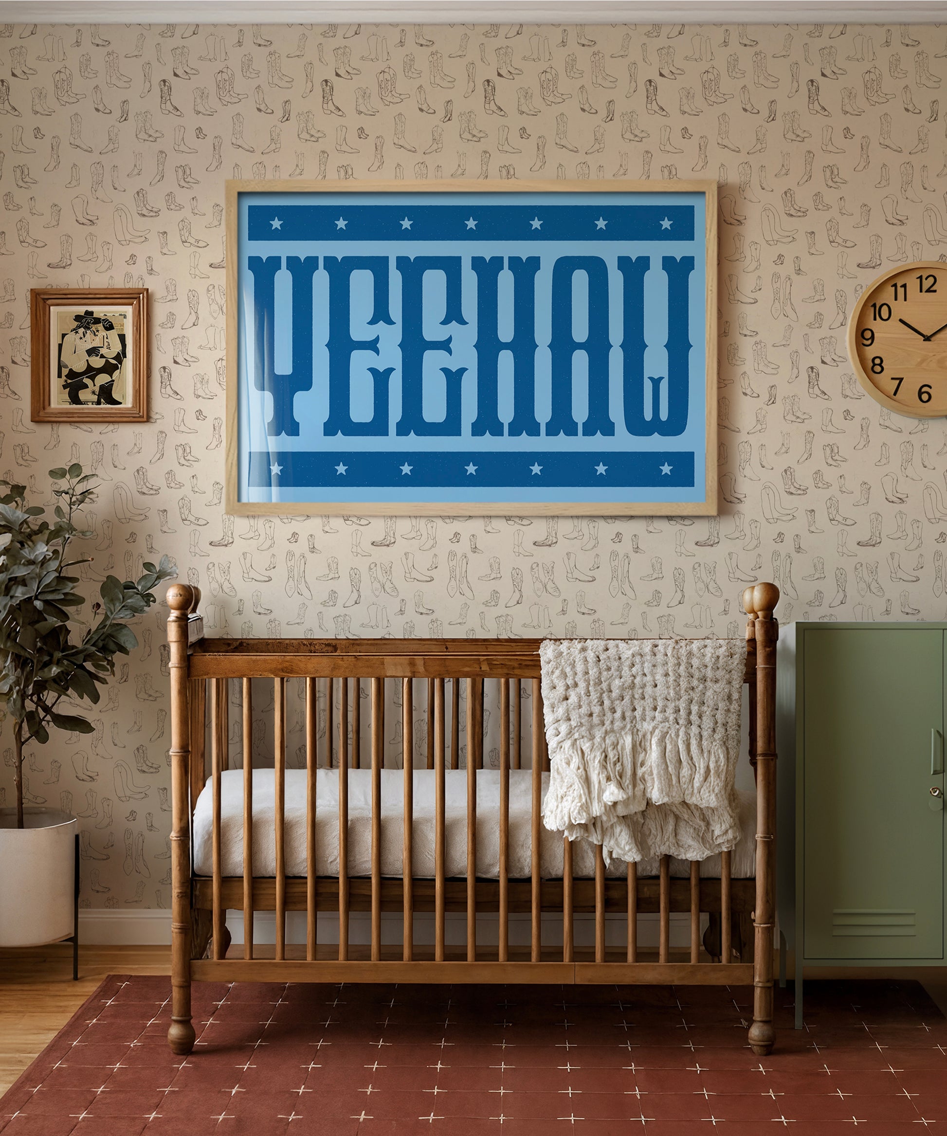 Yeehaw! This bold western typography print brings big cowboy energy to your little one’s room. With custom-designed type inspired by the Wild West, it’s got that vintage rodeo charm with a modern twist. The perfect way to wrangle some western style into your nursery, this print will have your little cowboy ready to ride off into the sunset.