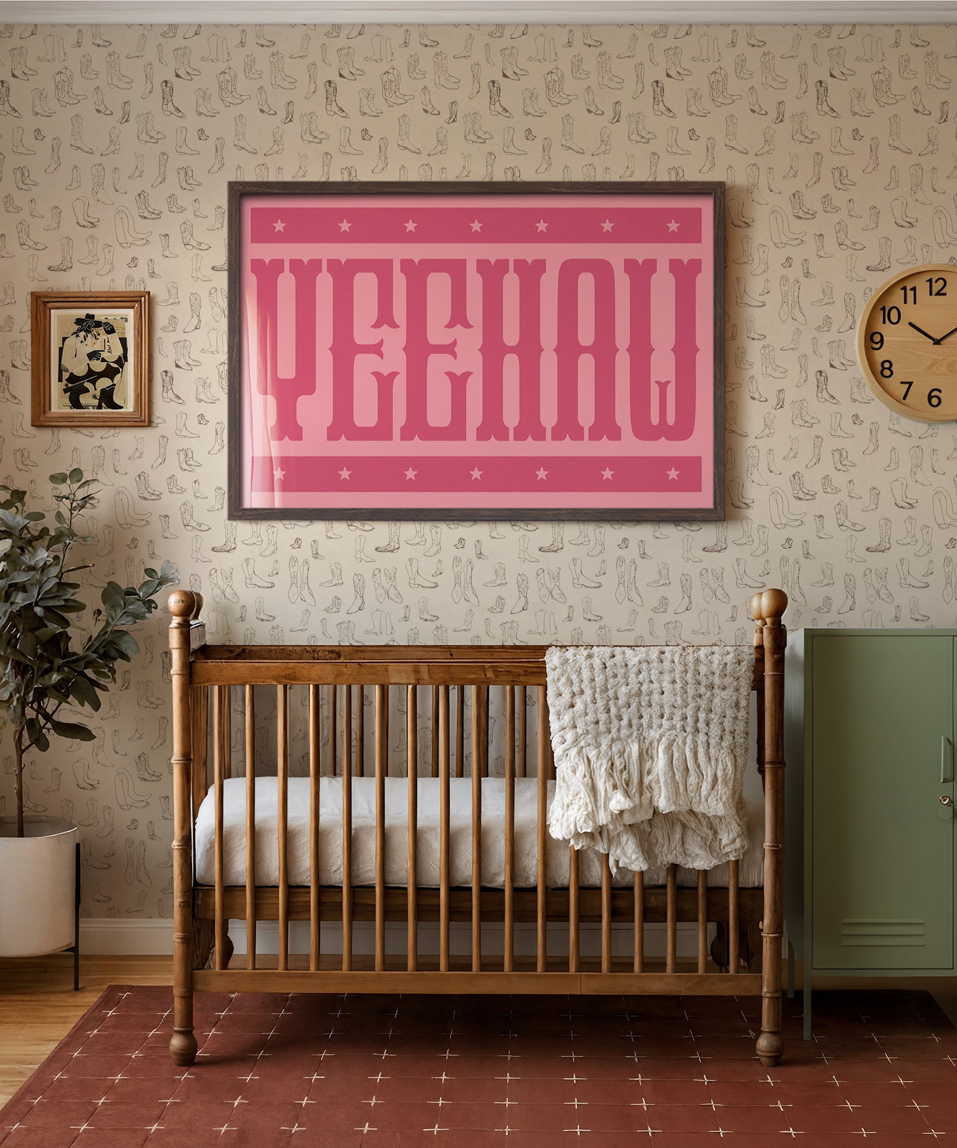 Yeehaw! This bold western typography print brings big cowboy energy to your little one’s room. With custom-designed type inspired by the Wild West, it’s got that vintage rodeo charm with a modern twist. The perfect way to wrangle some western style into your nursery, this print will have your little cowgirl ready to ride off into the sunset.