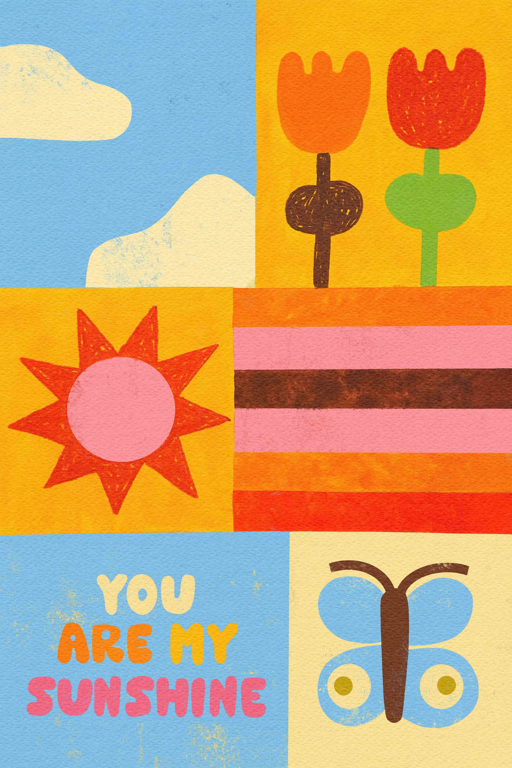Bring sunshine into any space with this bright and cheerful print! Created in collaboration with illustrator Priscilla Moreno, it features a colorful grid of clouds, flowers, and a butterfly. Its vivid hues will bring joy to your walls, always serving as a reminder to your little one that they are your sunshine.