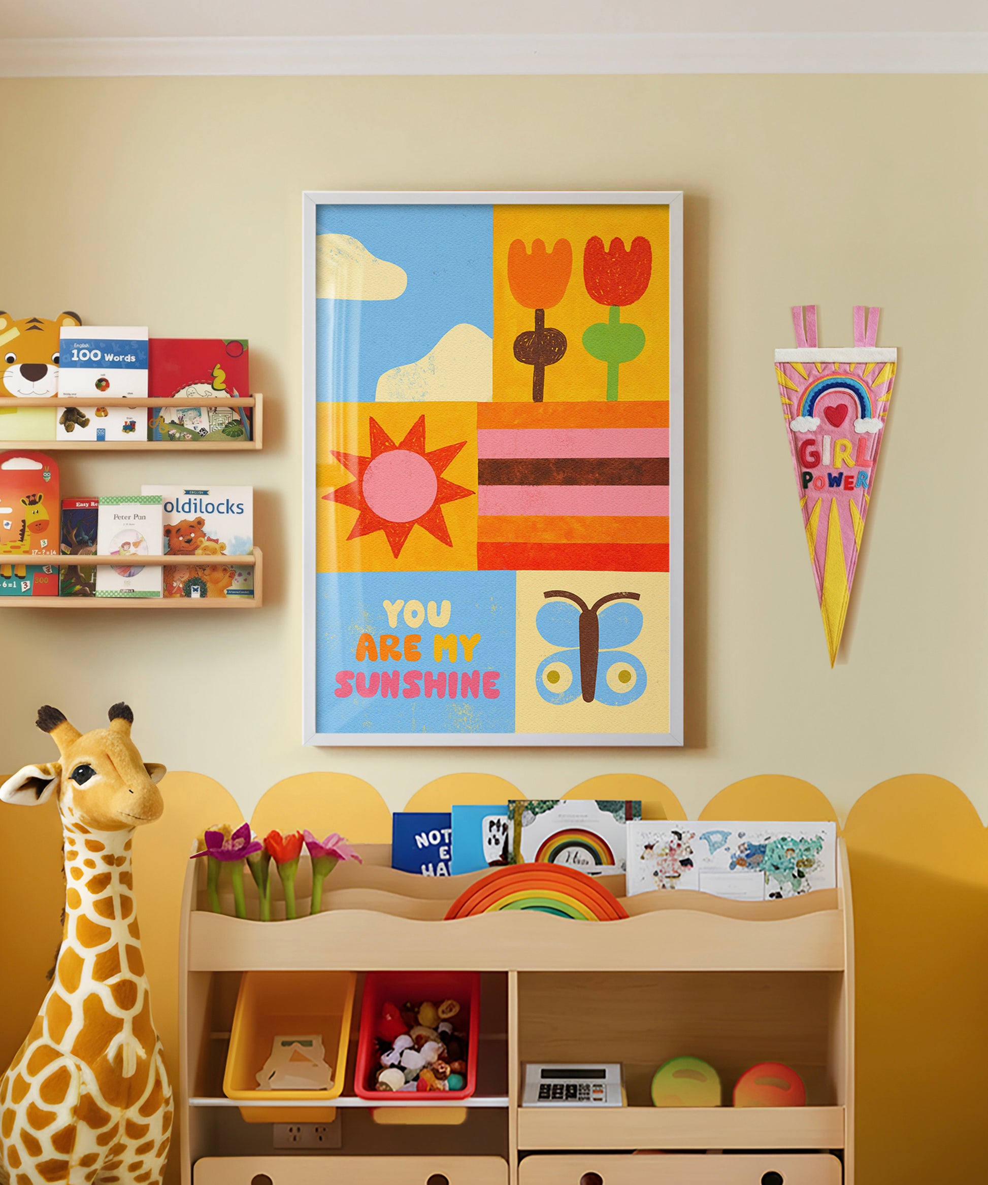 Bring sunshine into any space with this bright and cheerful print! Created in collaboration with illustrator Priscilla Moreno, it features a colorful grid of clouds, flowers, and a butterfly. Its vivid hues will bring joy to your walls, always serving as a reminder to your little one that they are your sunshine.